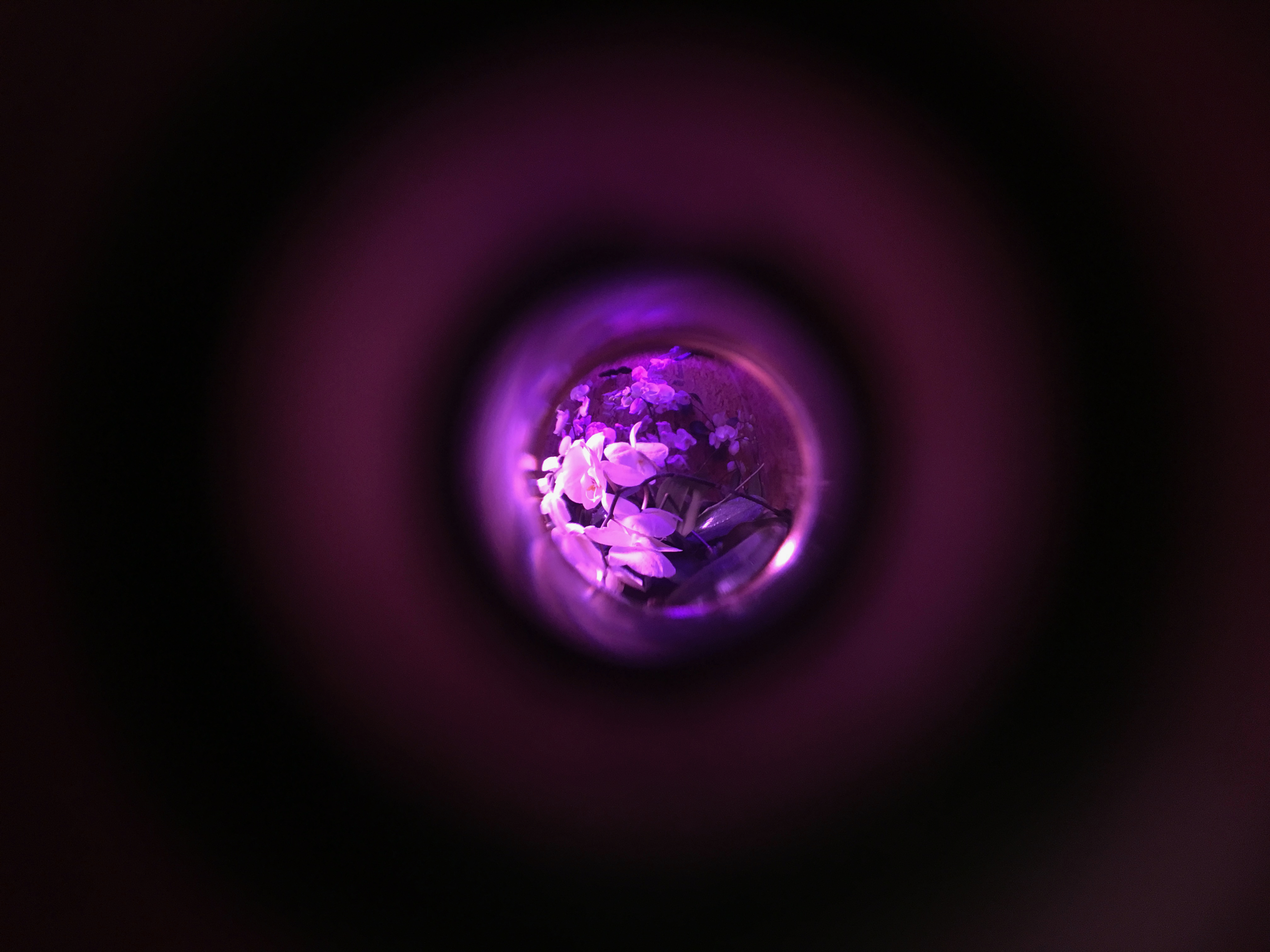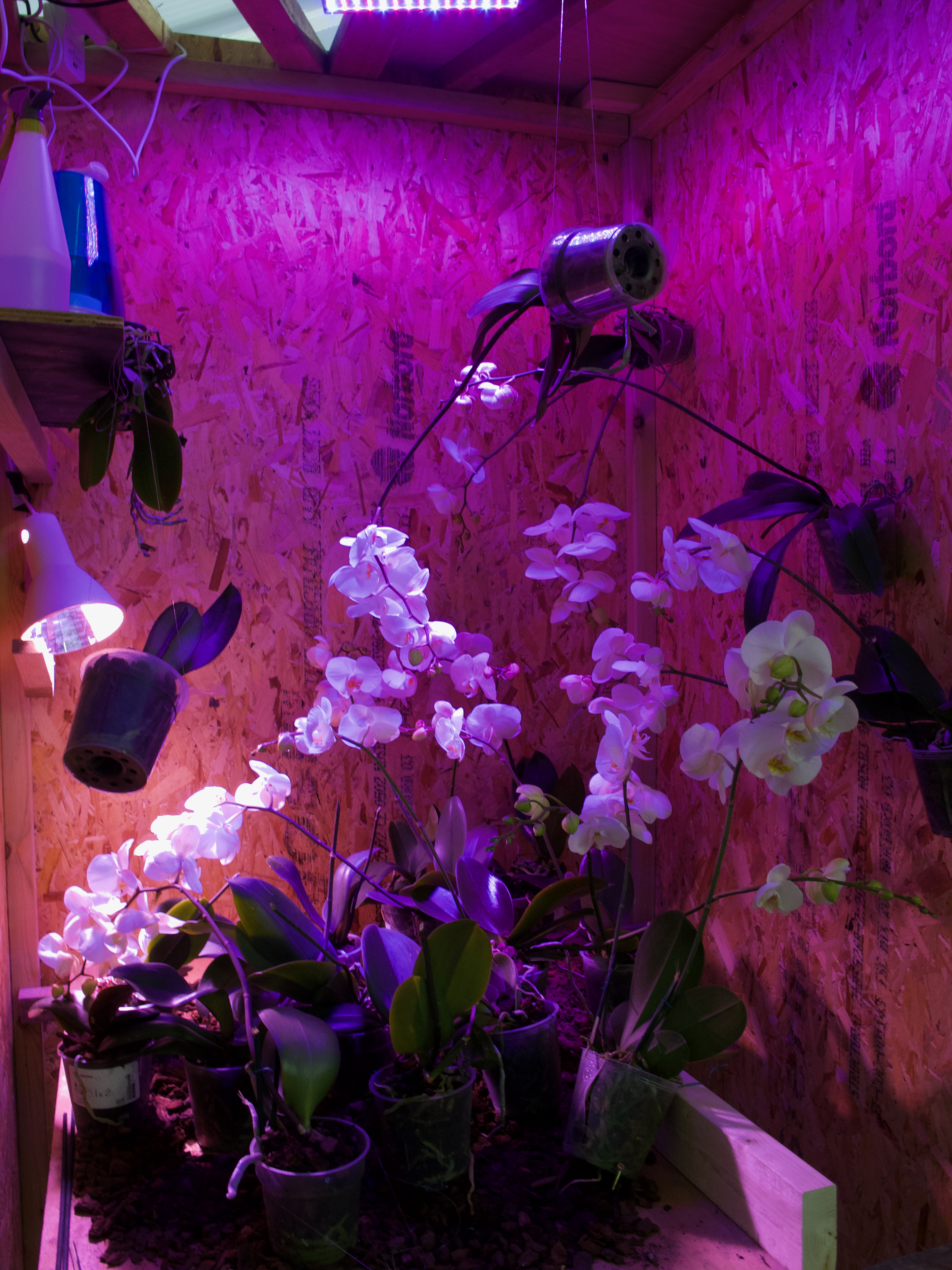 Chipboard, peephole, orchids, mulch, humidifier, grow lamps